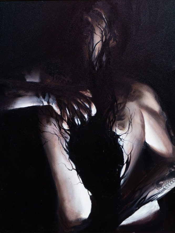 Der Kampf gegen die innere Dunkelheit, das Auseinandersetzen damit, ist einer der schwersten. Dieses Selbstbildnis entstand 2019, in einer Phase eben dieses Kampfes.